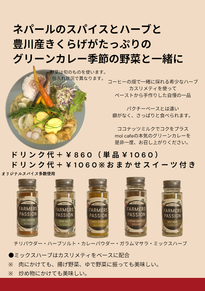 Mol Cafe, located at 5 Chome-22 Higashiyutakamachi, Toyokawa, Aichi 442-0025, Japan, offers a delightful menu that caters to a variety of tastes, focusing on the comforting charm of coffee and light bites. The café’s Grand Menu features a collection of dishes perfect for any time of day, but it’s their coffee that truly stands out. The Coffee Menu offers a rich selection of freshly brewed beverages, including classic choices and unique variations to satisfy every coffee lover.